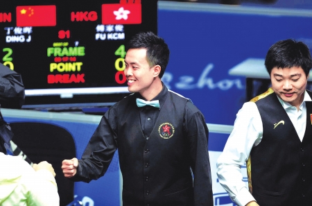 | 丁俊晖(右)傅家俊磨嘴皮,谁捧哏谁逗哏?雷远东摄 |