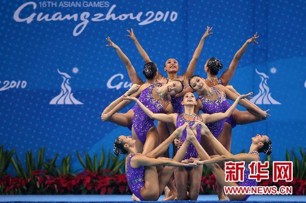 11月20日,中国队队员在比赛中。当日,在佛山进行的广州亚运会花样游泳集体项目比赛中,中国队以192.000分的总成绩获得冠军。新华社记者费茂华摄