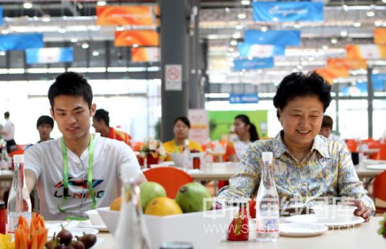 北京时间11月11日上午,中共中央政治局委员,国务委员刘延东来到广州亚运会运动员村,看望中国代表团的教练和运动员。刘延东委员详细询问了运动员的生活情况,并和运动员一起进餐。图为羽毛球运动员林丹(左)与国务委员刘延东一起用餐。