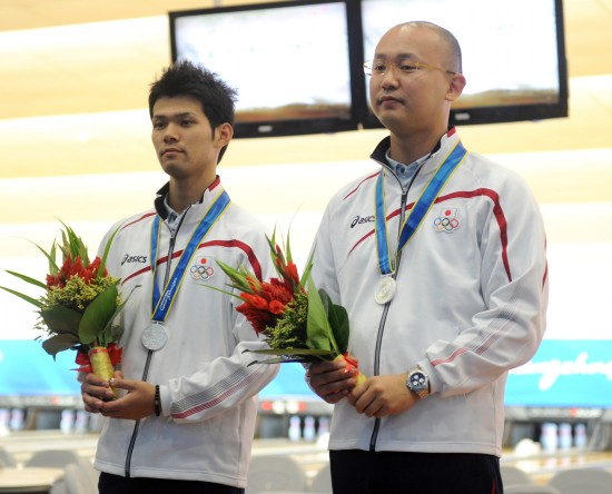11月18日,日本选手和田翔吾(左)/山下知且在颁奖仪式上。当日,第16届亚运会保龄球项目男子双人赛颁奖仪式举行,马来西亚选手洪显龙/廖健良以2711分夺冠。日本选手和田翔吾/山下知且和新加坡选手贾森/王雷明以2691分并列亚军。