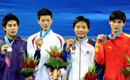11月20日,泰国选手本益-甲拉革、中华台北选手魏辰洋、菲律宾选手保罗-罗梅罗和中国选手许永增(从左至右)在颁奖仪式上。当日,在广东体育馆举行的第16届亚运会跆拳道男子58公斤以下级比赛中,魏辰洋战胜泰国选手本益-甲拉革,获得冠军。本益-甲拉革获得银牌。保罗-罗梅罗和许永增获得铜牌。
