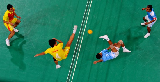 11月26日,中国选手周海洋(左二)在比赛中防守。当日,在广州进行的第16届亚运会藤球男子双人预赛中,中国队以2比1战胜印度队。