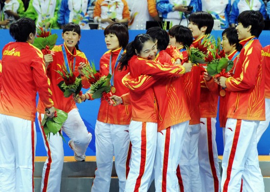 11月26日,中国队队员在颁奖仪式后庆祝。当日,在广州举行的第16届亚运会女子手球决赛中,中国队以31比22战胜日本队,获得金牌。