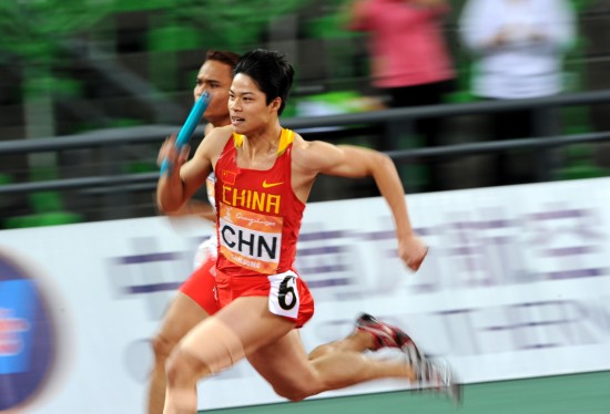 11月26日,中国队选手苏炳添(右)在比赛中。当日,在广州奥体中心体育场进行的第16届亚运会田径男子4X100米接力决赛中,中国队夺得金牌。