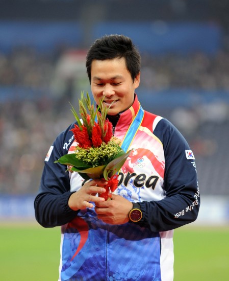 11月26日,韩国选手朴财明在颁奖仪式上。当日,在广州奥体中心体育场进行的第16届亚运会田径男子标枪决赛中,朴财明获得银牌。