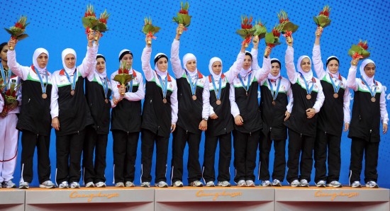 11月26日,伊朗队队员在领奖台上。当日,在第16届亚运会女子卡巴迪决赛中,印度队战胜泰国队获得冠军,泰国队获得亚军,孟加拉国队和伊朗队并列季军。