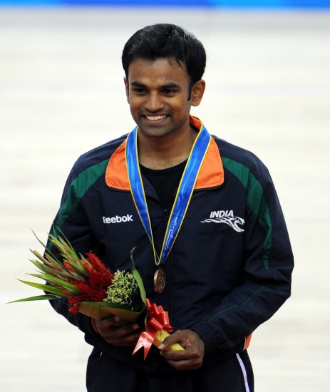 11月26日,印度选手阿努普-库马尔-亚马在领奖台上。 当日,在第16届亚运会花样轮滑男子单人自由滑比赛中,日本选手西木绅悟夺得冠军,中华台北选手叶家成和印度选手阿努普-库马尔-亚马分获第二、三名。