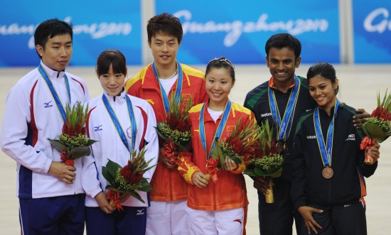 11月26日,中国组合唐云亲/林雅雯(中)、中华台北组合陈立昕/翁慈霞(左)和印度组合阿瓦妮-巴拉特-库马尔-潘恰尔/阿努普-库马尔-亚马在领奖台上合影。 当日,在第16届亚运会花样轮滑双人自由滑比赛中,中国组合唐云亲/林雅雯获得冠军,中华台北组合陈立昕/翁慈霞获得亚军,印度组合阿瓦妮-巴拉特-库马尔-潘恰尔/阿努普-库马尔-亚马获得季军。