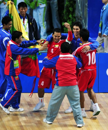 11月27日,缅甸队选手在夺冠后庆祝。当日,在第16届亚运会藤球男子双人决赛中,缅甸队以2比0战胜韩国队,夺得冠军。
